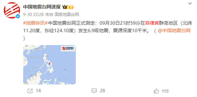 值得注意的是,当地时间9月30日21时59分,菲律宾宿务省北部发生大地震,震级6.9级,震源深度10千米。