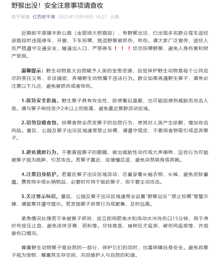 皎平渡镇政府也对外发布提示称,皎平渡镇半新公路有野猴出没,已出现多名群众驾车途经该路段时违规停车,开窗、下车投喂、挑逗野猴被抓伤、咬伤