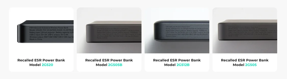 此次召回共涉及四个具体型号,分别是 2G520、2G505B、2G512B 和 2G505。这些产品均为口袋尺寸设计,背面印有“ESR”品牌标识,侧面则印有型号代码,并配有五个圆形的LED电量指示灯。消费者可以根据侧面的文字轻松识别产品型号。这些充电宝自2022年9月起至2025年7月期间,通过亚马逊、ESR官网及Home Depot等线上渠道在美国和加拿大销售。