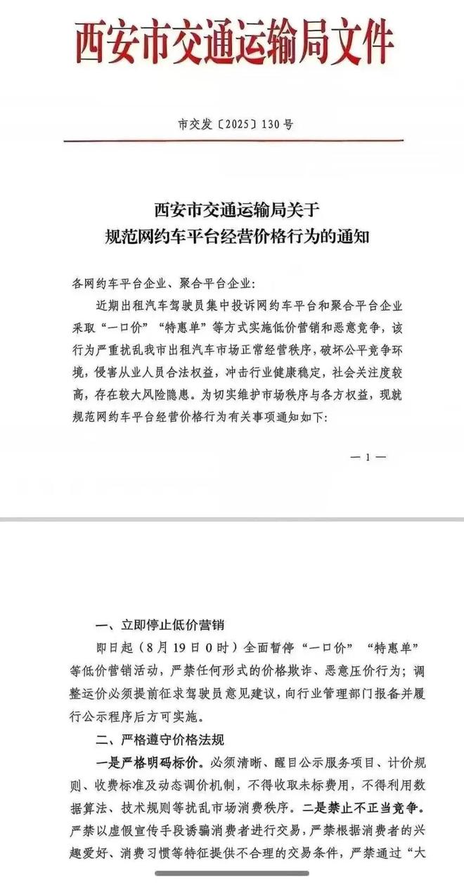 多地暂停网约车“一口价”等低价营销行为。近日,陕西西安等地出台政策,全面暂停网约车“一口价”等低价营销行为,严禁任何形式的价格欺诈和恶意压价。而在此前,江西鹰潭、河南开封、广东清远等多地也相继出台类似政策,禁止平台以“一口价”模式强制司机接单,治理无序低价竞争行为。一些通知指出,这类订单扰乱了市场秩序,侵害了从业人员权益。