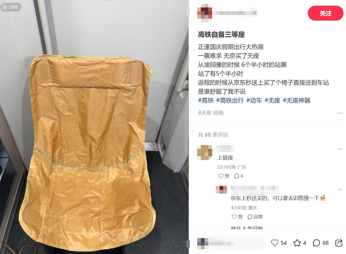 一位网友在社交平台上表示,正逢国庆假期出行大热潮,一票难求,无奈买了无座,返程的时候从京东秒送上买了个椅子直接送到车站,自称“高铁三等座”。
