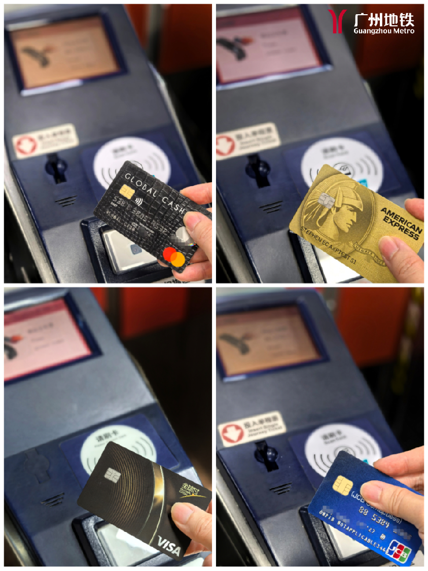 外籍乘客可持以上任意卡片在广州地铁所有车站标有卡组织标识的闸机直接“拍卡过闸”。