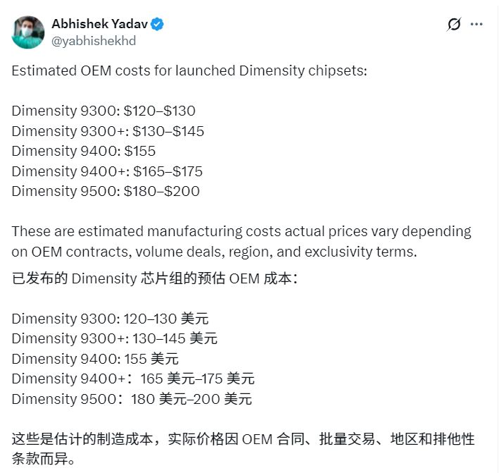 据最新透露,天玑9500的预估价格在180至200美元之间,而第五代骁龙8至尊版的单价达280美元,这意味着天玑9500比骁龙8至尊版便宜55%左右。当然,这些价格是预估的制造成本,实际价格会因联发科与合作伙伴的合同条款、采购量、地区以及独家协议等因素而有所不同。