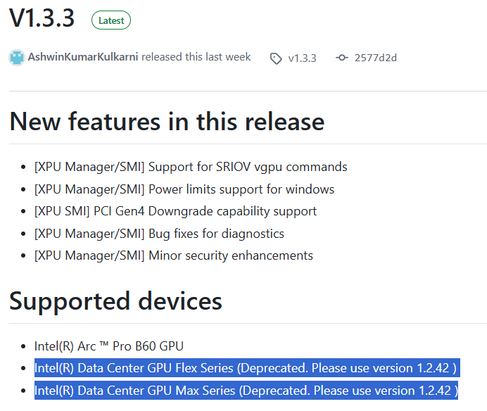 不过随着XPU Manager 1.3.3版本的发布,Intel数据中心GPU Flex系列和Max系列现在被认为已过时,依赖这些GPU的用户被建议迁移到较早的XPU Manager 1.2版本系列。