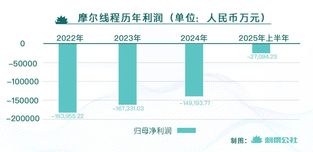 首先是扭亏时间遥遥无期。尽管相比2024年、2023年,摩尔线程在2025年上半年的亏损规模大幅度收窄,但最近三年,摩尔线程的经营性现金流持续为负,意味着这家公司本质上还不具备自我造血的能力,公司运营非常依赖外部融资,当前摩尔线程的累计亏损已经超过50亿元人民币,主要是高昂的研发支出造成了巨大的运营成本。