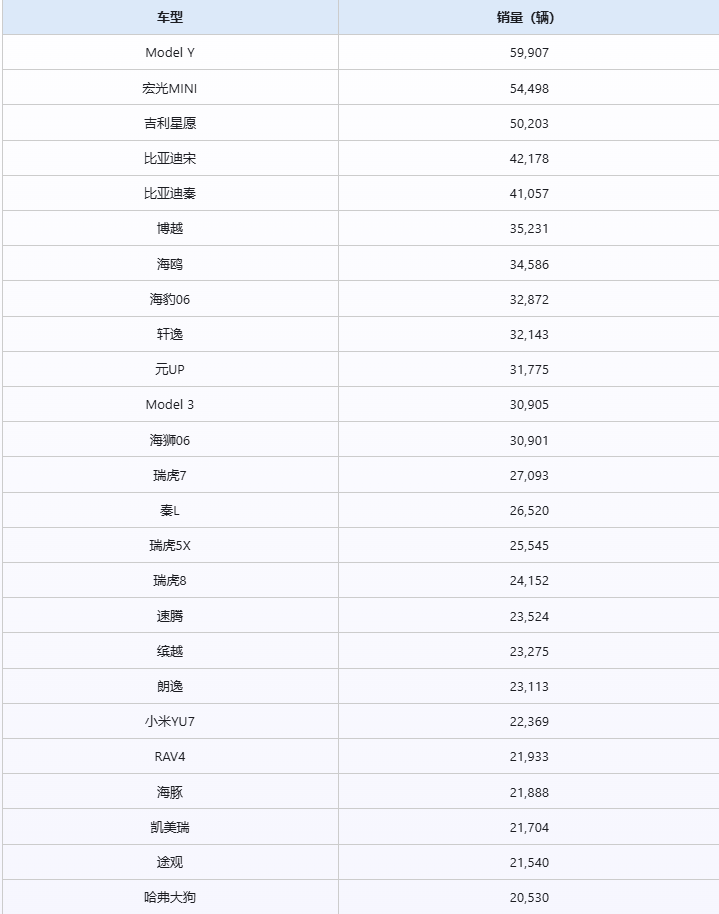 位列Model Y之后的是宏光MINI(54498辆)与吉利星愿(50203辆),二者销量均突破5万辆,分别占据榜单第二、三位。