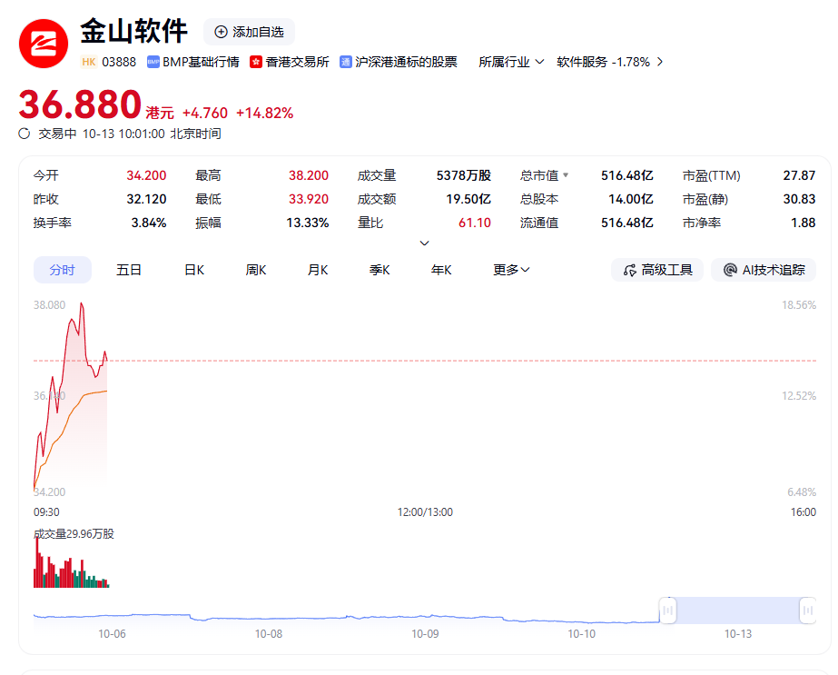 金山软件股价涨超14%,一度涨超18%。消息方面,有网友发现,商务部10月9日发布2025年第61号公告,对含有中国成分的部分境外稀土相关物项实施出口管制。