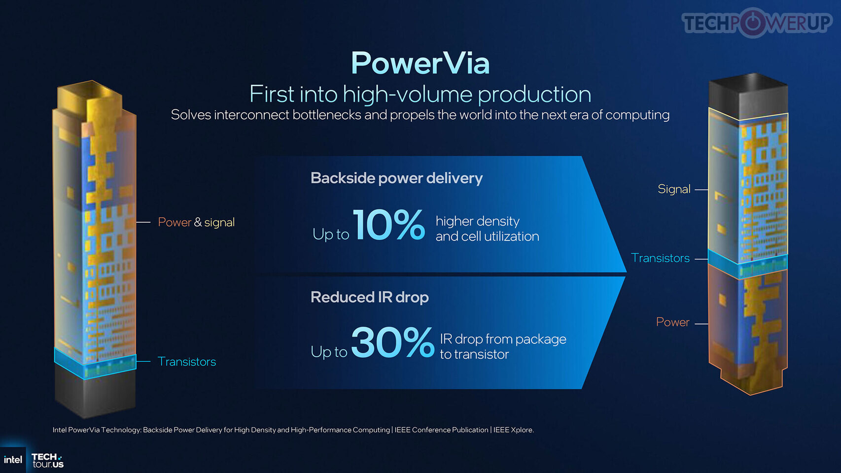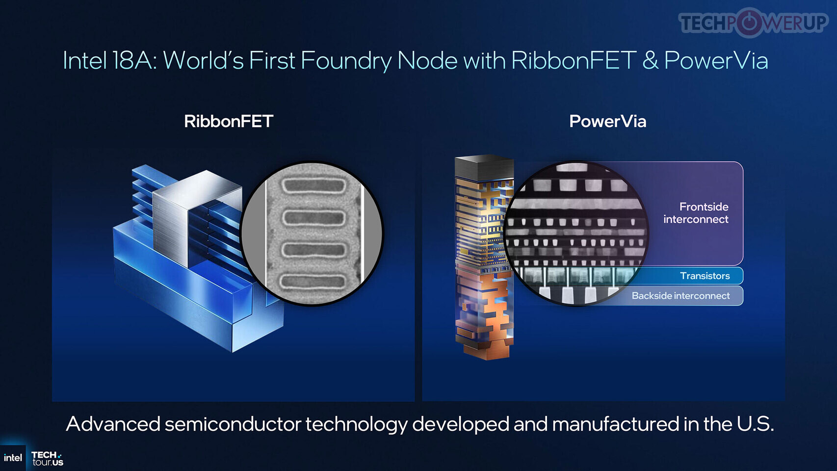 在晶体管层面,18A引入了两项重要创新:RibbonFET全环绕栅极晶体管与PowerVia背面供电技术。RibbonFET用水平硅带替代传统垂直FinFET鳍片,并由栅极材料包裹,从而提升静电控制、降低泄漏电流,并缩短栅极长度。英特尔表示,从FinFET过渡至18A的RibbonFET后,栅极长度缩短约5-10%,且每只晶体管的功耗降低超20%。PowerVia则将电源网络转移至晶圆背面,释放前端金属层用于信号布线,缩短供电路径,减少高切换频率下的电压降。这些创新共同降低了切换能耗,并为设计师带来更高的频率或更低的功耗空间,尤其适合笔记本及移动产品。