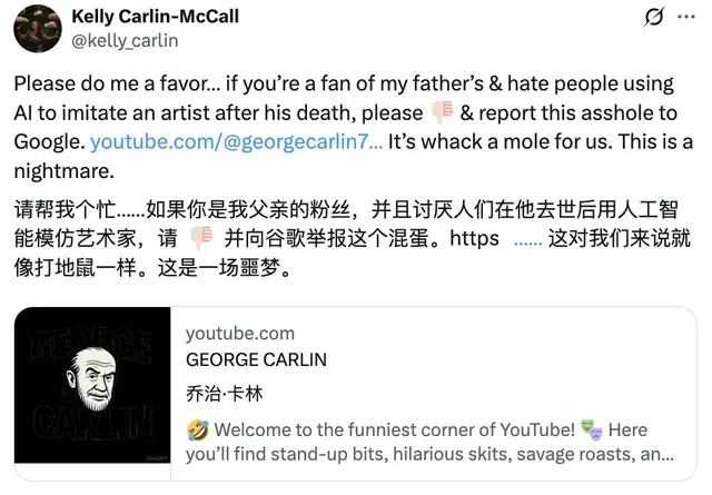 值得一提的是,不单单只有泽尔达,已故喜剧演员乔治·卡林的女儿也表达了类似的观点。她觉得使用她父亲肖像的视频既“令人难以忍受,又令人沮丧”。