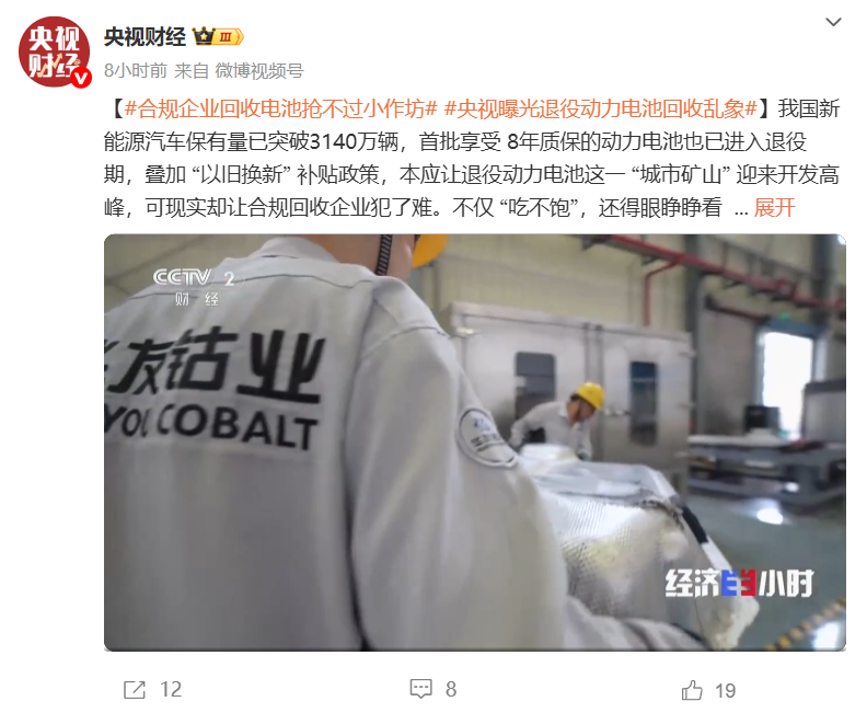 央视曝光退役动力电池回收乱象 合规企业回收电池抢不过小作坊