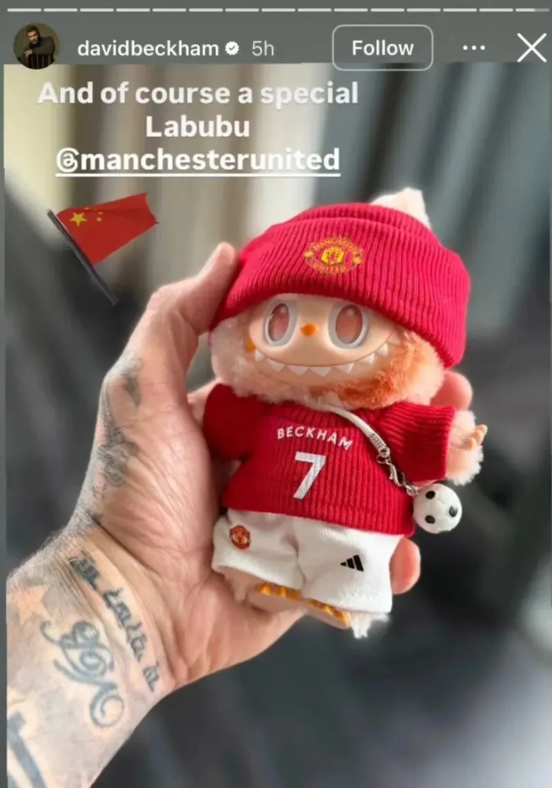 10月14日晚,贝克汉姆更新社交平台,晒出了特别定制款的曼联款LABUBU,该LABUBU身着贝克汉姆的7号球衣,身上还背了个小足球。网友感叹:贝克汉姆终于有LABUBU。据媒体报道,该LABUBU是粉丝送的。