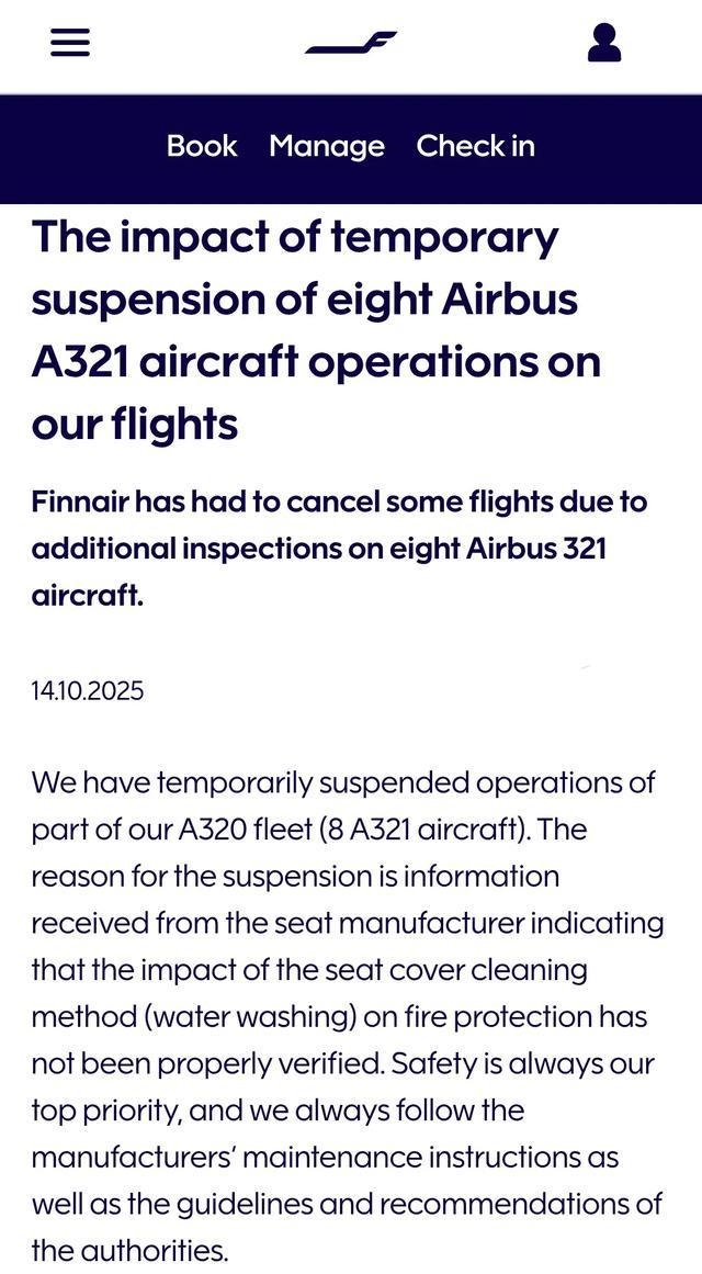 公告称,座椅套使用水洗后,引发了安全担忧——座椅供应商在原始设计或审定时,并未充分验证这种洗法对座椅面料/内芯的防火性能,是否有破坏作用。出于安全原则,芬航选择暂停这些飞机,做额外的验证和安全确认。