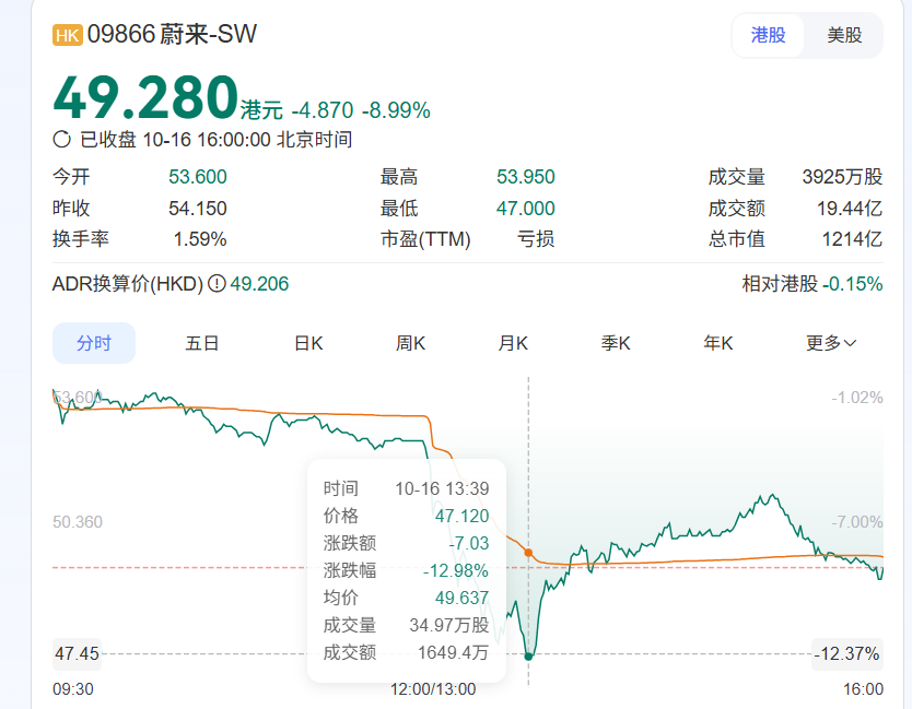 今日蔚来港股大跌,盘中一度跳水13%,收盘跌8.99%,报价49.28港元,成交额19.44亿港元。消息面上,一则“新加坡政府投资公司(GIC)起诉蔚来”的消息引发业界关注。