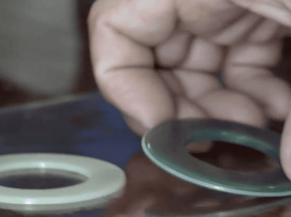 上图标记的内凹,是指在奖牌的金属环和玉环边缘均留有一圈沟槽。然后有一个卡在玉环和金属之间做缓冲的 O 型圈,见下图的实物展示。如果奖牌是竖着坠地,这中间物就可以消除掉振动波。