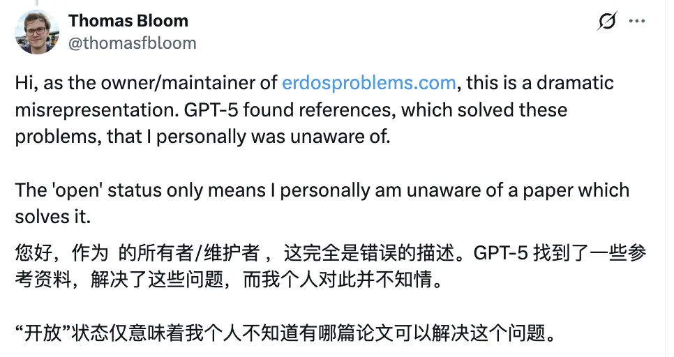 作为erdosproblems .com网站的拥有者和维护者,我得声明:OpenAI的说法明显夸大了事实。GPT-5只是通过网络搜索,找到了早已存在的论文,这些论文中早就解答了这些问题,只是我个人不知道而已。网站上的“未解”状态只是说明我尚未发现相关的论文,而不代表全世界数学界没有解决方案。