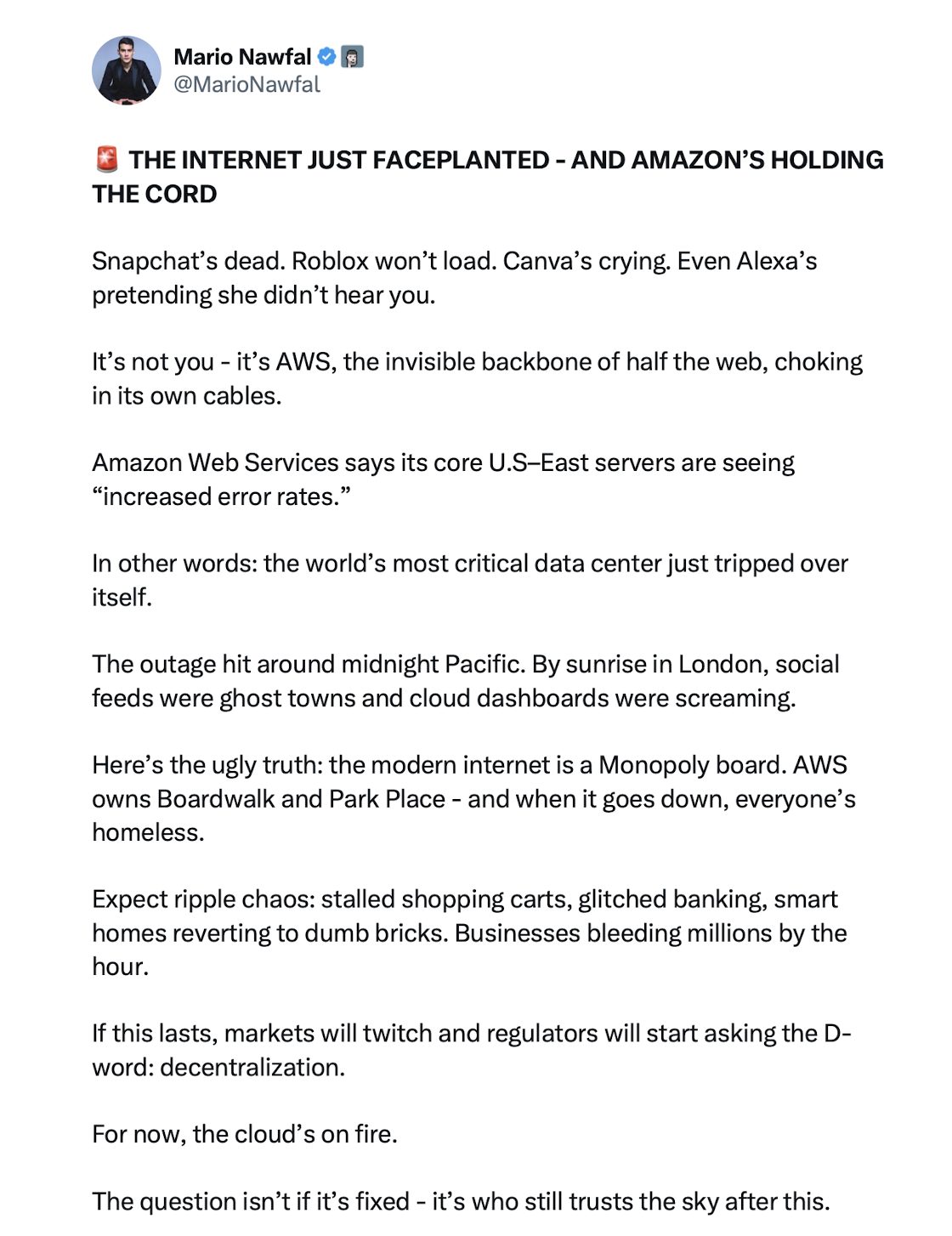 Coinbase在X平台上发文称:“我们注意到,由于AWS故障,目前许多用户无法访问Coinbase。我们的团队正在处理该问题,后续将在此更新进展。所有资金均安全。”