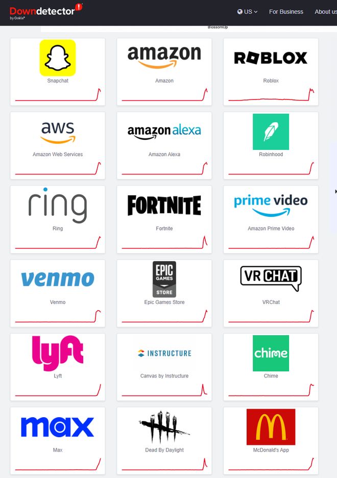 追踪网络故障的网站DownDetector报告称,数十个主要网站出现问题,涵盖亚马逊、移动支付平台Venmo、视频流媒体平台Hulu、麦当劳、加密货币交易平台Coinbase等。