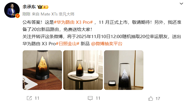 华为常务董事、终端BG董事长余承东公布了日前预告的神秘新品“日照金山”真实面目:华为路由X3 Pro。余承东称,这款产品将于11月正式上市,同时还将抽取20名幸运网友送出这款高端路由器。