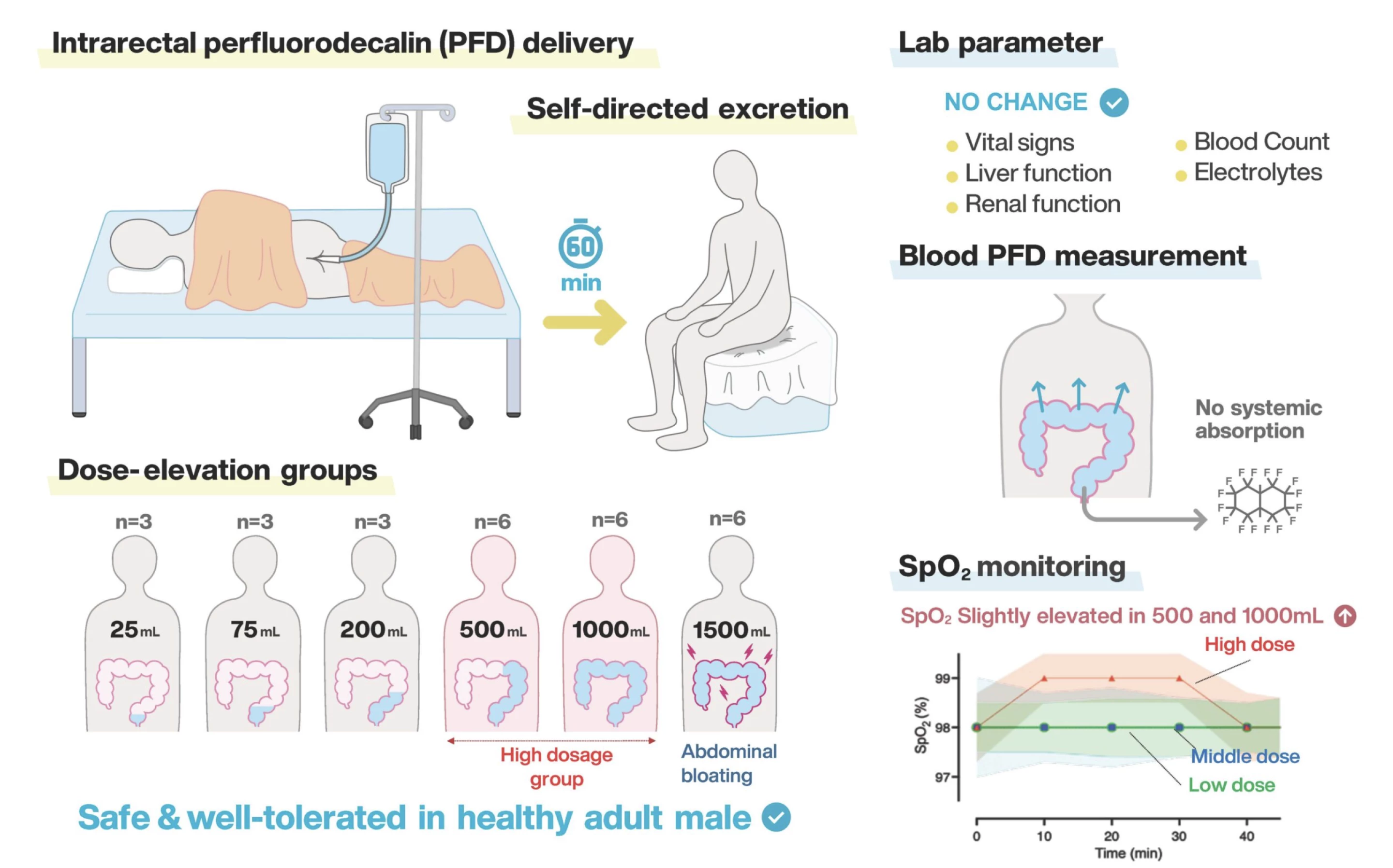 其中,20名受试者成功保留液体60分钟。即使在最大注入量下,仅有轻度腹胀和不适等副作用,且所有肝肾等临床指标均保持在正常范围。研究人员指出,这项“首个人体研究表明,经肠注射未充氧的全氟癸烷具有安全性、可行性和良好耐受性。结果为后续采用富氧液体支持呼吸衰竭患者的技术发展奠定了重要基础”。
