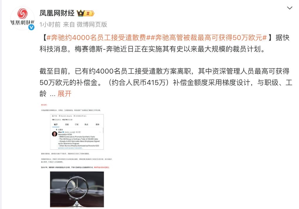 据媒体报道,梅赛德斯-奔驰裁员计划迎来实质性进展,已有约4000名员工接受遣散方案离职。离职补偿方面采用梯度设计,与职级、工龄直接挂钩,还设置了“加速奖金”激励员工尽早决策,其中对于资深管理人员最高提供50万欧元(折合人民币约415万元)的补偿金。