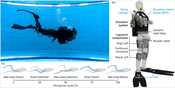 该水下外骨骼提供了一种全新的生物启发式推进方案,有望应用于延长水下作业时间、减轻潜水员疲劳以及辅助潜水训练等多个场景,为未来水下助游设备的设计与评估提供了重要参考。