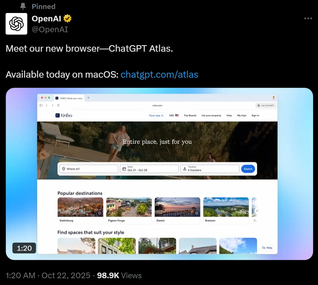 OpenAI再次向Google发起冲锋!就在刚刚,OpenAI发布了一款以ChatGPT为核心打造的全新浏览器——ChatGPT Atlas。