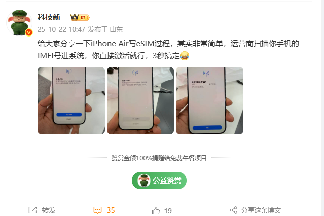 今日,国行iPhone Air正式上市发售,标志着中国智能手机市场正式迈入eSIM时代。数码博主“科技新一”分享了国行iPhone Air开通eSIM的过程。