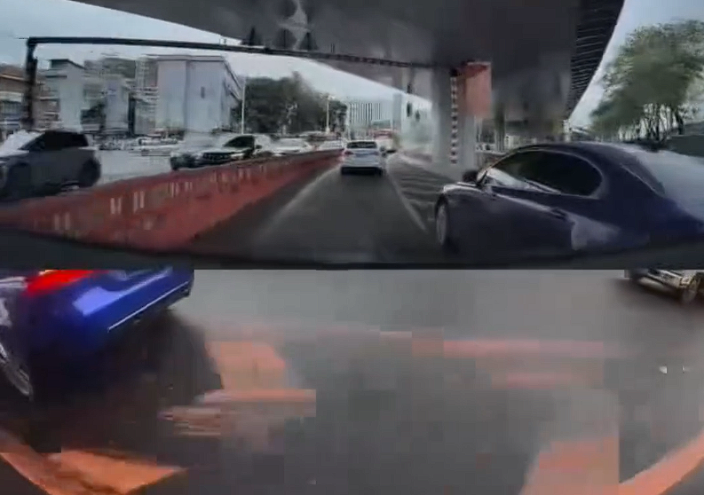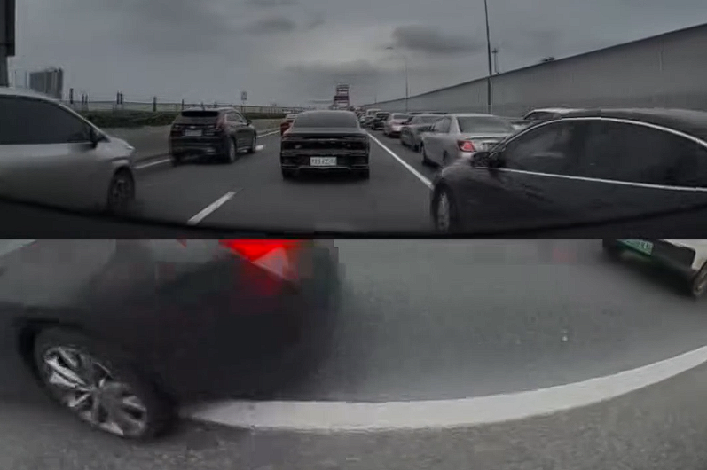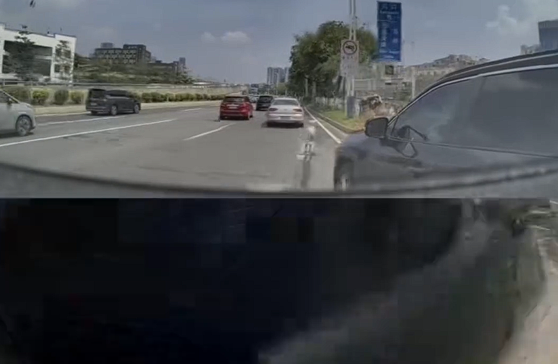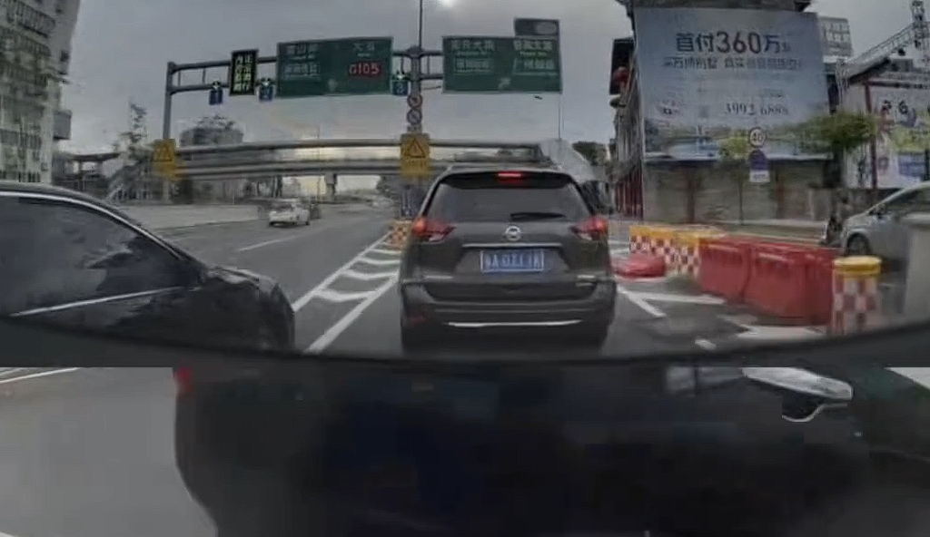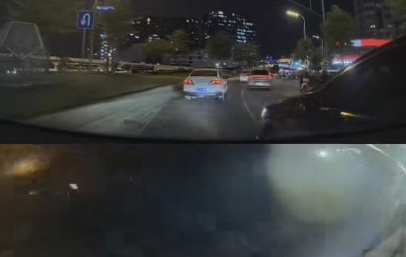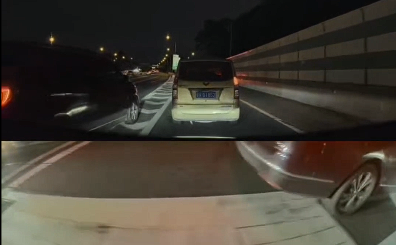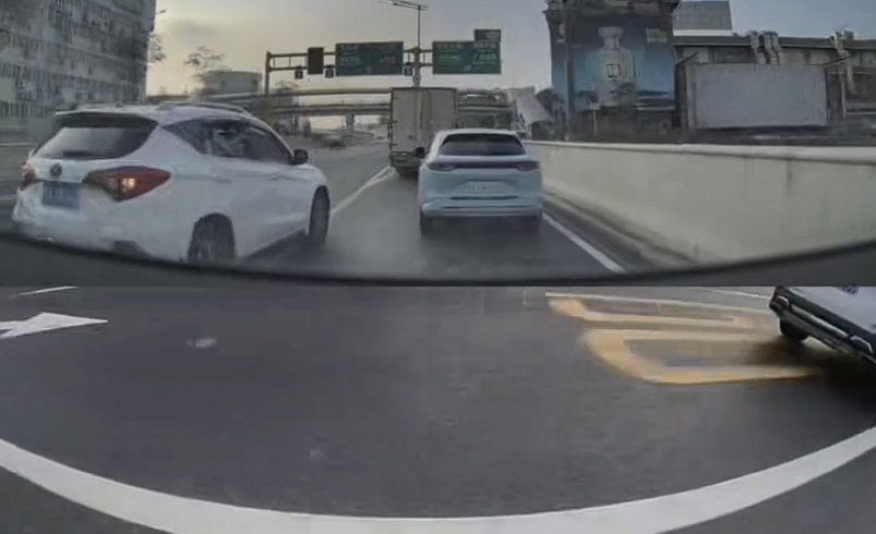 从行车记录仪拍摄的视频看,撞车场景有非常高的相似性,那就是对方压实线或者压导流线变道,该网友发现类似情况后,会踩油门加速向前制造事故