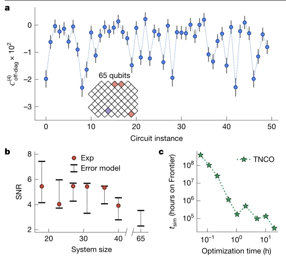 这种“大循环干涉”让经典计算机很难模拟。他们用最强超级计算机Frontier尝试模拟 65 个量子比特的 OTOC⁽²⁾信号,需要约 3.2 年;而量子处理器测一次只需要 2.1 小时,速度差了1.3万倍。