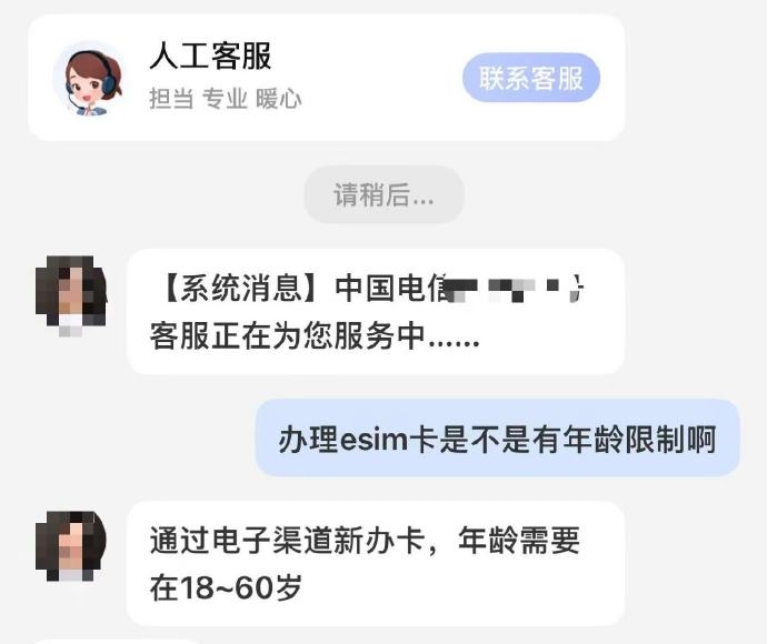 中国电信客服也确认存在该规定,并表示:“目前eSIM业务仍处于试运营阶段,因此设有相关年龄限制,后续可能会根据实际情况进行调整。”