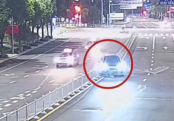 好不容易过了路口,紧接着便开始向左偏离车道,最终冲撞烂了中央护栏。
