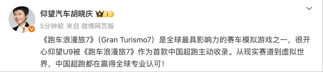 10月24日,仰望汽车官宣,仰望U9作为首款中国超跑将入驻《跑车浪漫旅7》(GT7)。仰望销售事业部总经理胡晓庆表示,《跑车浪漫旅7》是全球最具影响力的赛车模拟游戏之一,很开心仰望U9被《跑车浪漫旅7》作为首款中国超跑主动收录。从现实赛道到虚拟世界,中国超跑都在赢得全球专业认可。
