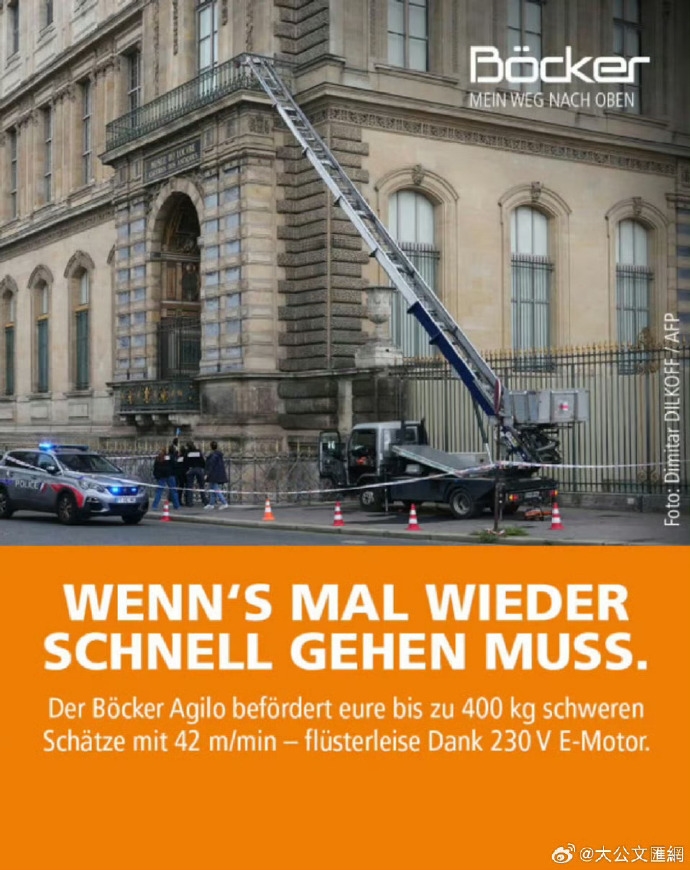 卢浮宫大劫案让德国升降梯制造商抓住商机——宣传自家设备运作“悄无声息”。德国升降梯制造商“Boecker”发现,自家产品出现在巴黎卢浮宫珠宝劫案中,劫匪乘坐该公司制造的升降梯从博物馆窗户潜入。
