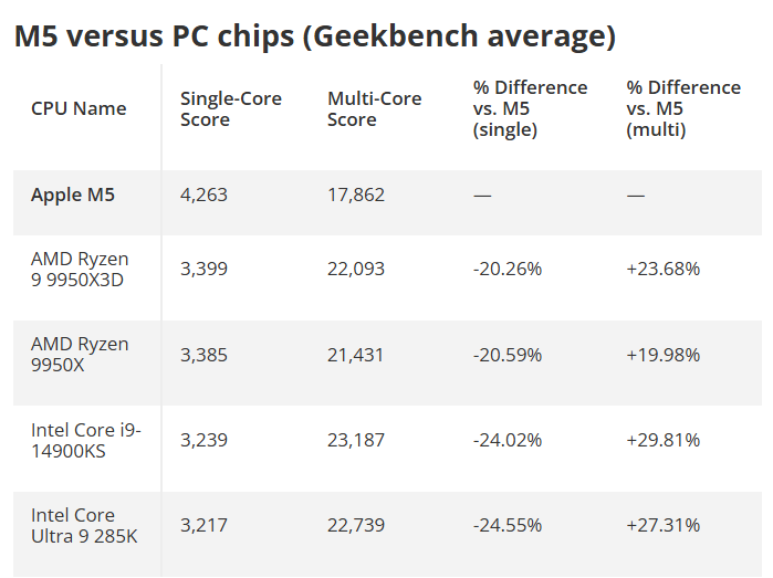 另外再GeekBench(AppleBench)测试中,苹果M5单核得分4263,同样远远领先精品:锐龙9 9950X3D 3399分、i9-14900KS 3239分、酷睿Ultra 9 285K 3217分。