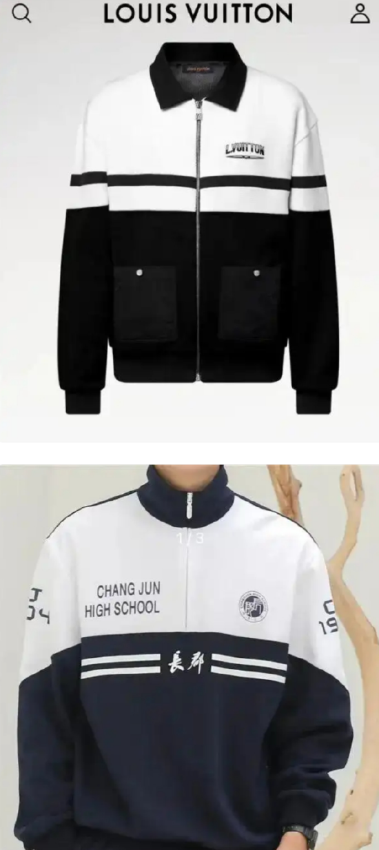 值得注意的是,这并非LV首次与中国校服“撞衫”。2023年,LV一款春季男装棒球夹克被指与南宁市中小学冬季校服相似,“LV 6.9万夹克酷似南宁校服”话题随后登上热搜,被网友调侃“70多元享受6.9万大牌同款。”