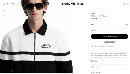 《BUG》栏目查询LV海外官网发现,该款大衣材质由79%棉与21%聚酰胺制成,胸前饰有刺绣工艺的“L.Vuitton”品牌标识,并且在意大利生产制造,售价为1900欧元,折合人民币约1.6万元,且除XL码外的码数均已售罄。