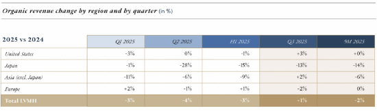 除日本以外的亚洲地区是LVMH最大的海外市场。LVMH财报显示,2025年上半年,中国所在的亚洲地区(除日本外)延续了去年以来的下降趋势,有机收入同比下滑9%,直至第三季度单季度才实现2%的小幅回升。