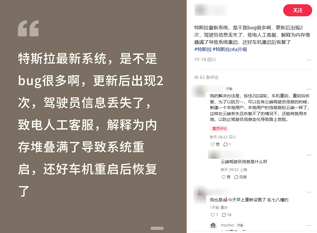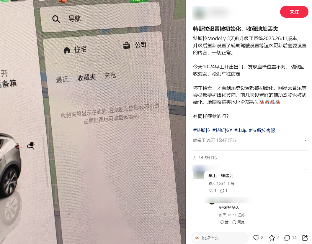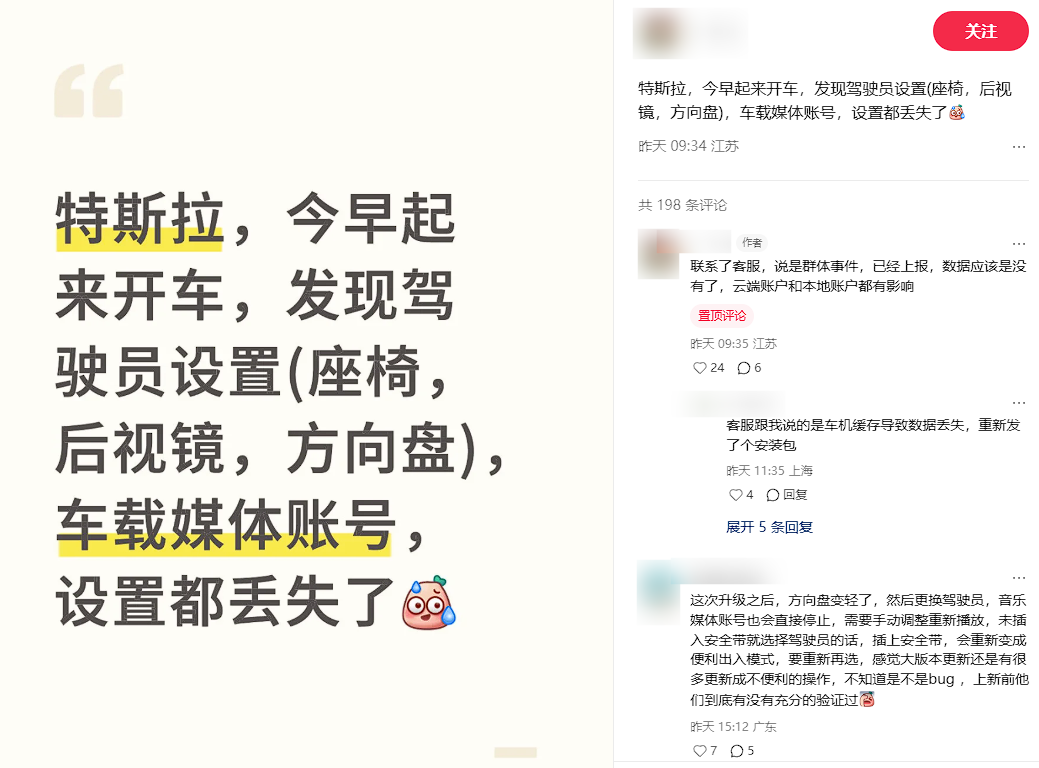 智能网联时代,可能某个小问题,就能带来大麻烦。昨日,不少特斯拉车主在小红书等社交平台反映称,平日自己设置好东西都变了,需要重新手动调整,有车主形容为“我的车突然不是我的车了!”