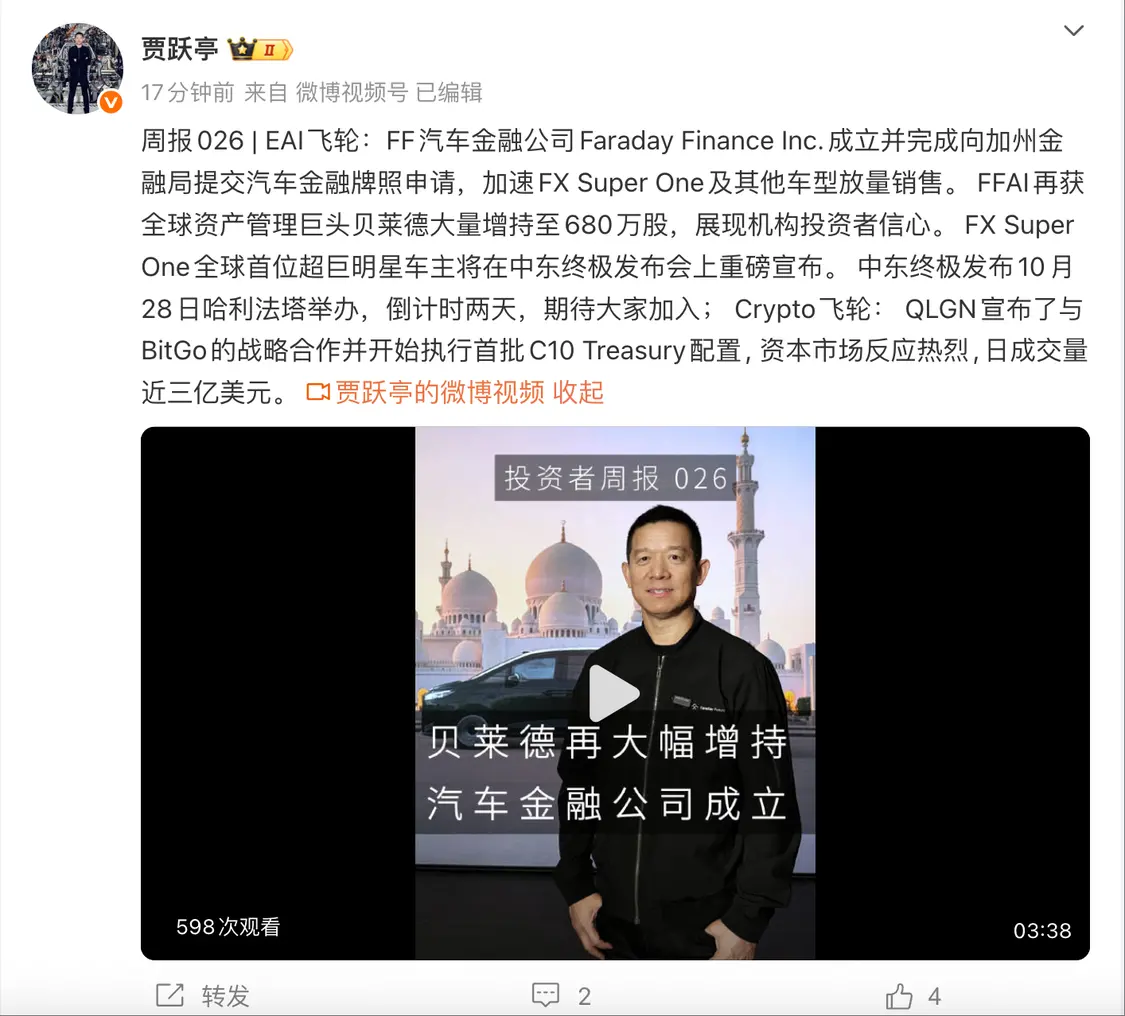 10月27日,贾跃亭发文,FF汽车金融公司Faraday Finance Inc.成立并完成向加州金融局提交相关汽车金融牌照的申请,加速新车放量销售,期待很快可以为FF和FX的购车用户提供定制化金融解决方案,包括购车贷款(Financing)和汽车长租(leasing)服务。