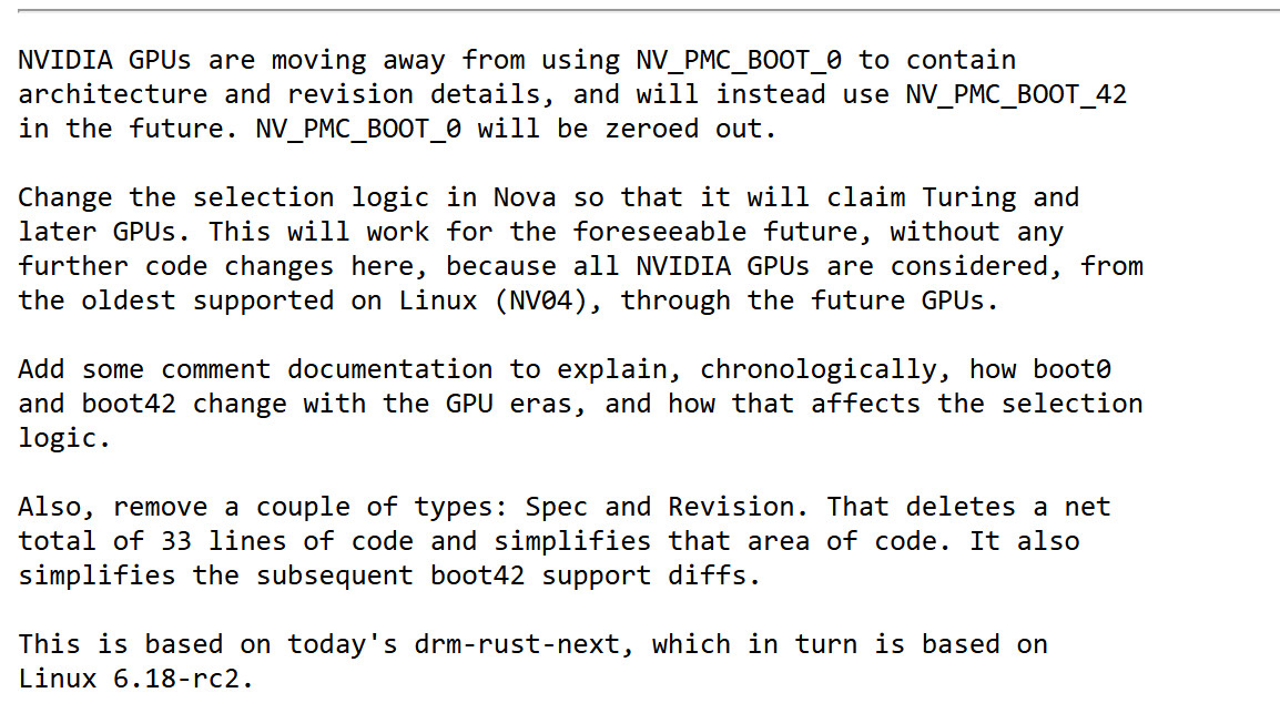 这些更新已提交到Nova内核驱动分支,这是此次早期开发工作的公开平台。补丁调整了检测逻辑,使驱动程序能通过新寄存器格式识别从Turing架构到后续GPU的设备。同时补丁中还补充了说明文档,解释了BOOT_0和BOOT_42在不同GPU代际中的演化,并移除了部分遗留类型如Spec和Revision。对此,开发者指出,这一简化有助于提升未来对boot42的支持,无需新一代芯片推出时再做繁琐的代际调整。
