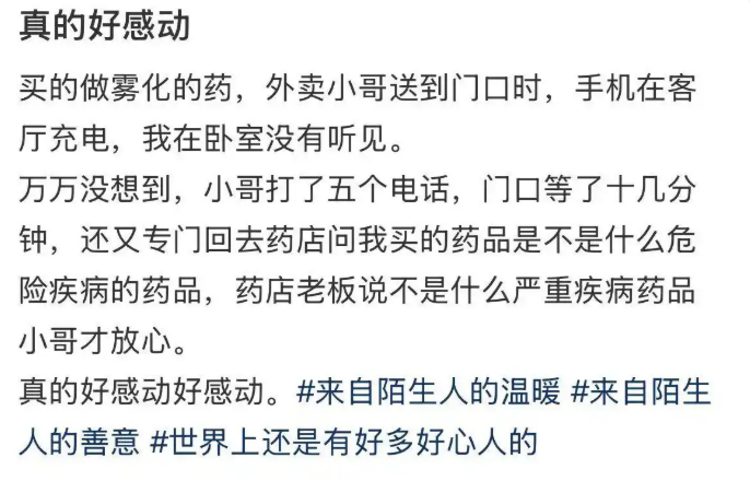 近日,甘肃一网友发布帖子称,自己买了做雾化的药,外卖小哥送到门口时,手机在客厅充电,自己在卧室没有听见。“万万没想到,小哥打了五个电话,门口等了十几分钟,还又专门回去药店问我买的药品是不是什么危险疾病的药品,药店老板说不是什么严重疾病药品小哥才放心。真的好感动好感动。”