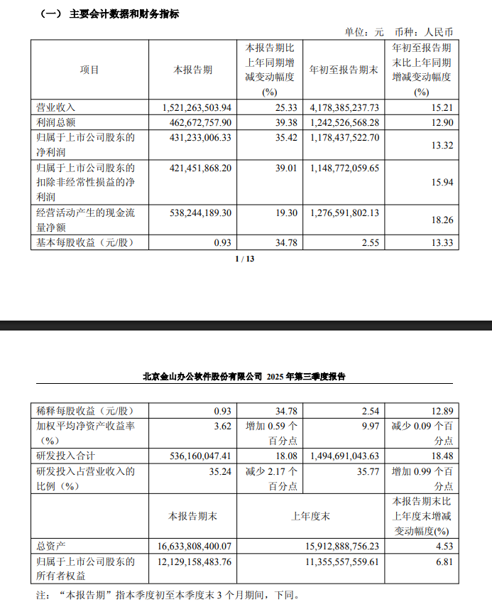 今晚,金山办公发布了2025年第三季度报告,第三季度实现营业收入15.21亿元,同比增长25.33%。归属于上市公司股东的净利润4.31亿元,同比增长35.42%。