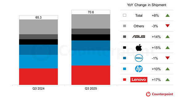 2025年Q3全球PC市场迎来回暖,据Counterpoint Research初步数据,该季度全球PC出货量同比增长8.1%。Windows 10停服带来的换机潮与美国进口关税政策变化引发的库存调整,成为市场增长核心驱动力。