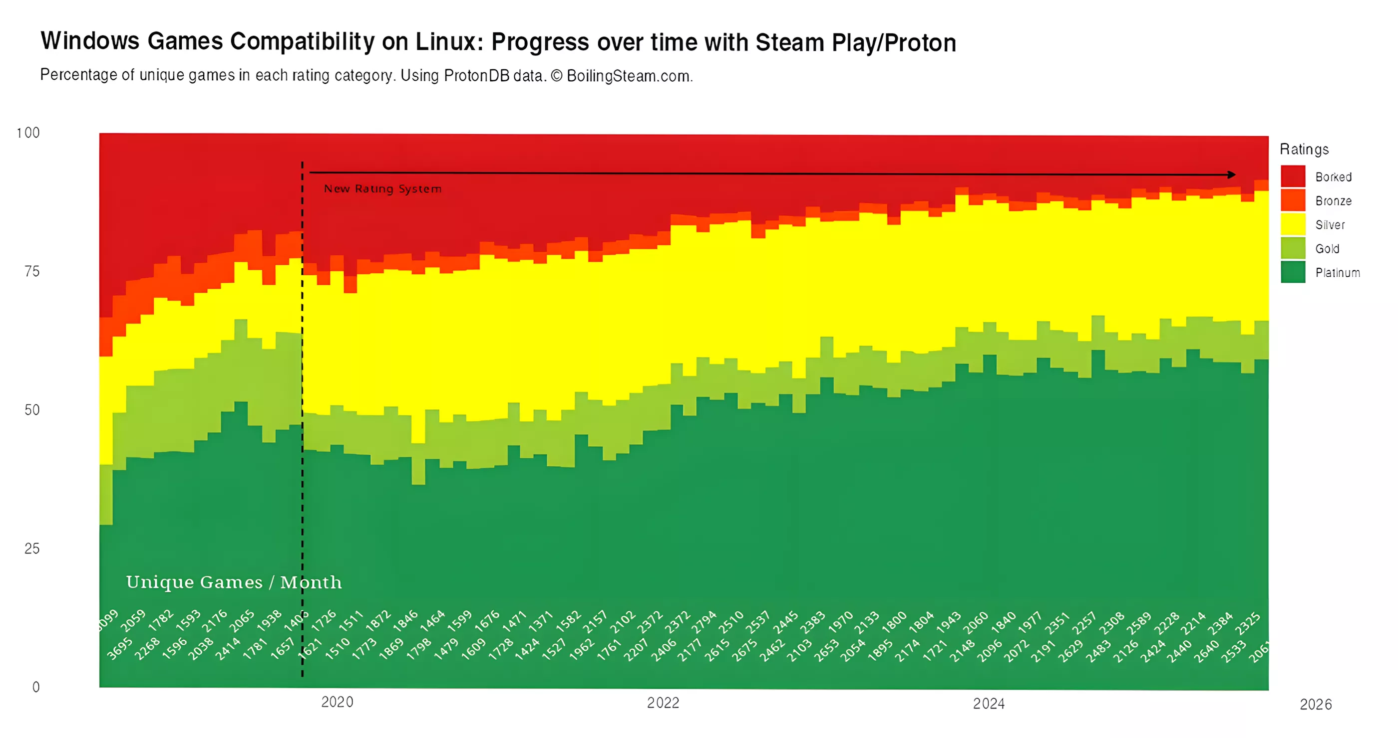 不仅如此,获得“铂金”和“黄金”评价的游戏比例也在持续攀升,越来越多Windows游戏在Linux系统上实现了令人满意的体验。尽管某些游戏(如March of Giants)被刻意设置阻止Linux兼容,部分则依赖尚未支持开源平台的防作弊系统,但整体趋势依旧向好。