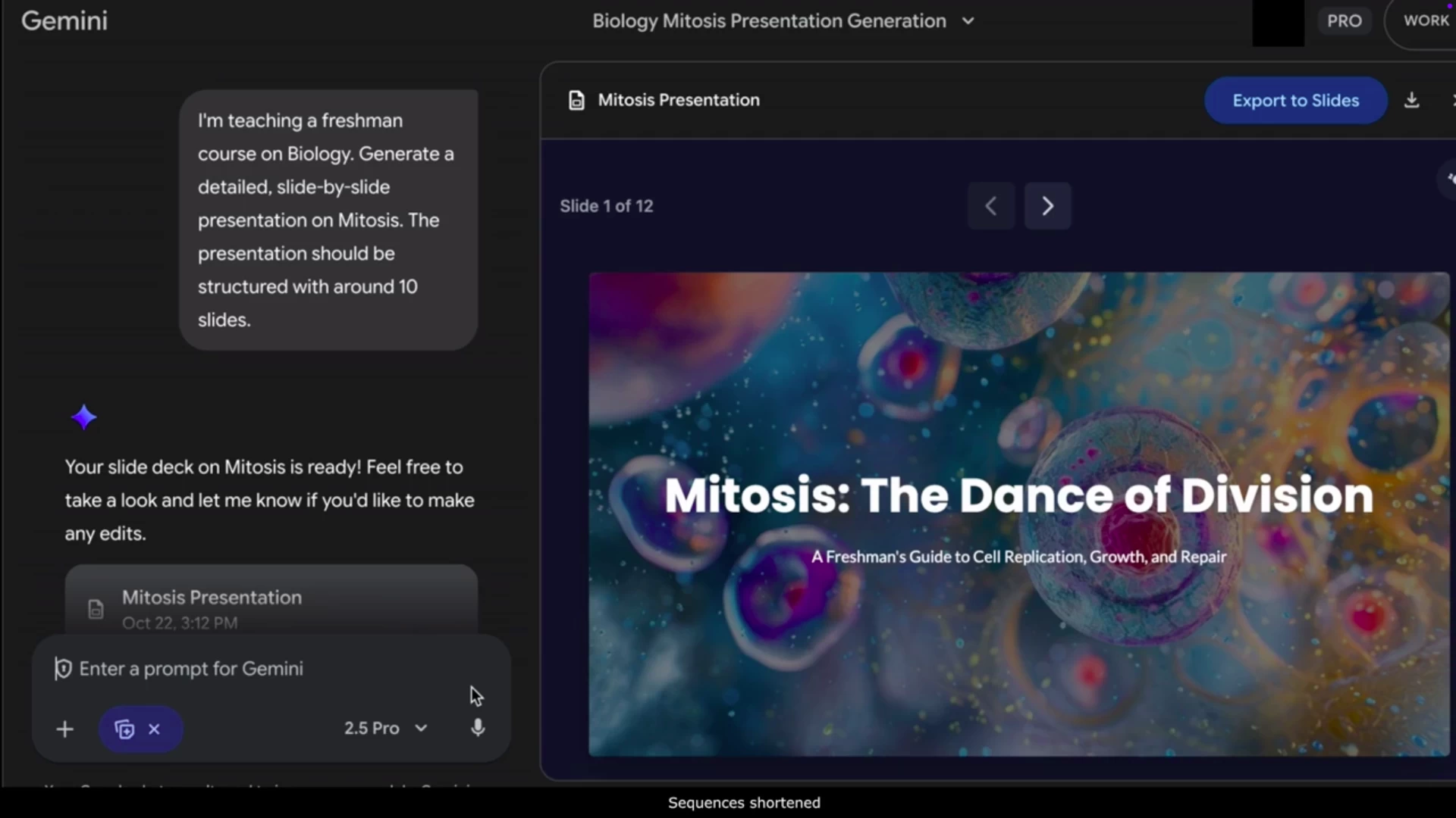 用户可通过输入文本提示或上传文件来生成带有主题、相关图片的幻灯片。Gemini还支持直接将生成的演示文稿导出到Google Slides中,方便用户进一步编辑或与他人协作。