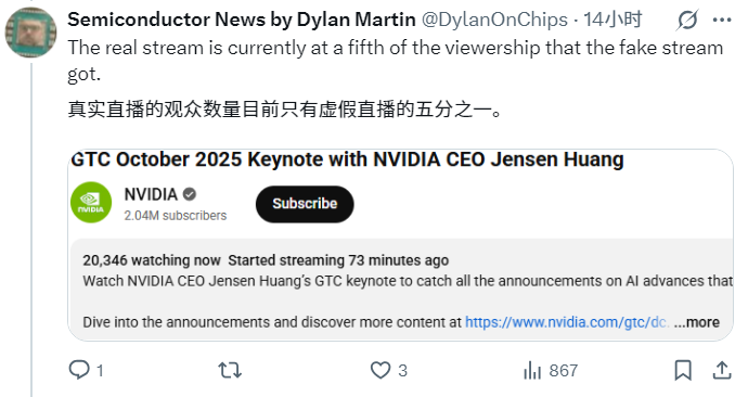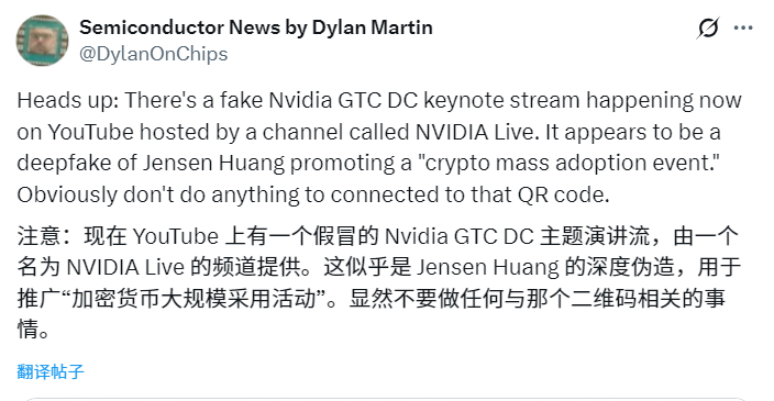 在NVIDIA GTC大会主题演讲当天,许多在YouTube上搜索官方直播的观众,可能意外地被引导至一个AI生成的黄仁勋“深度伪造”直播,公然宣传加密货币诈骗,并一度获得比官方直播高出数倍的观看量。