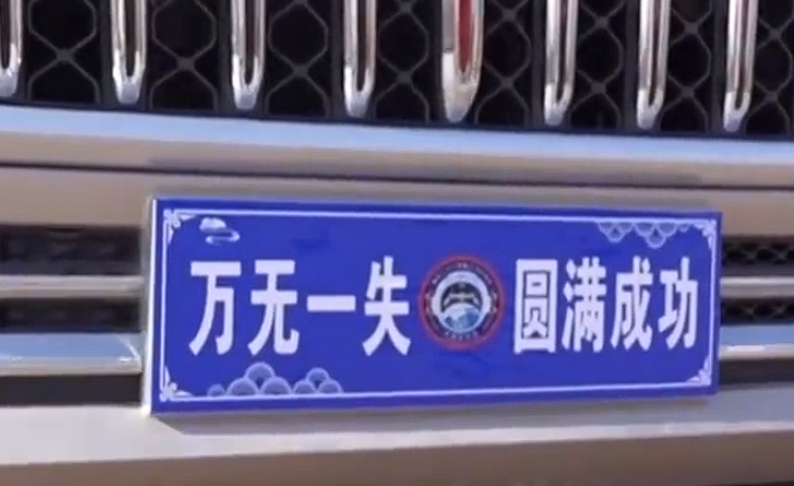 专用车辆保持原车大气恢弘的设计,不过并未悬挂普通车牌,而是换成了“万无一失,圆满成功”的中文。