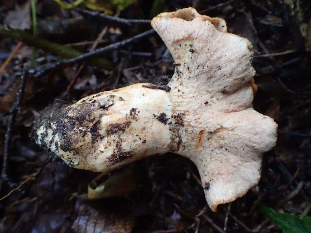 被砖红菌寄生菌寄生的乳菇,背面菌褶消失了,作者供图