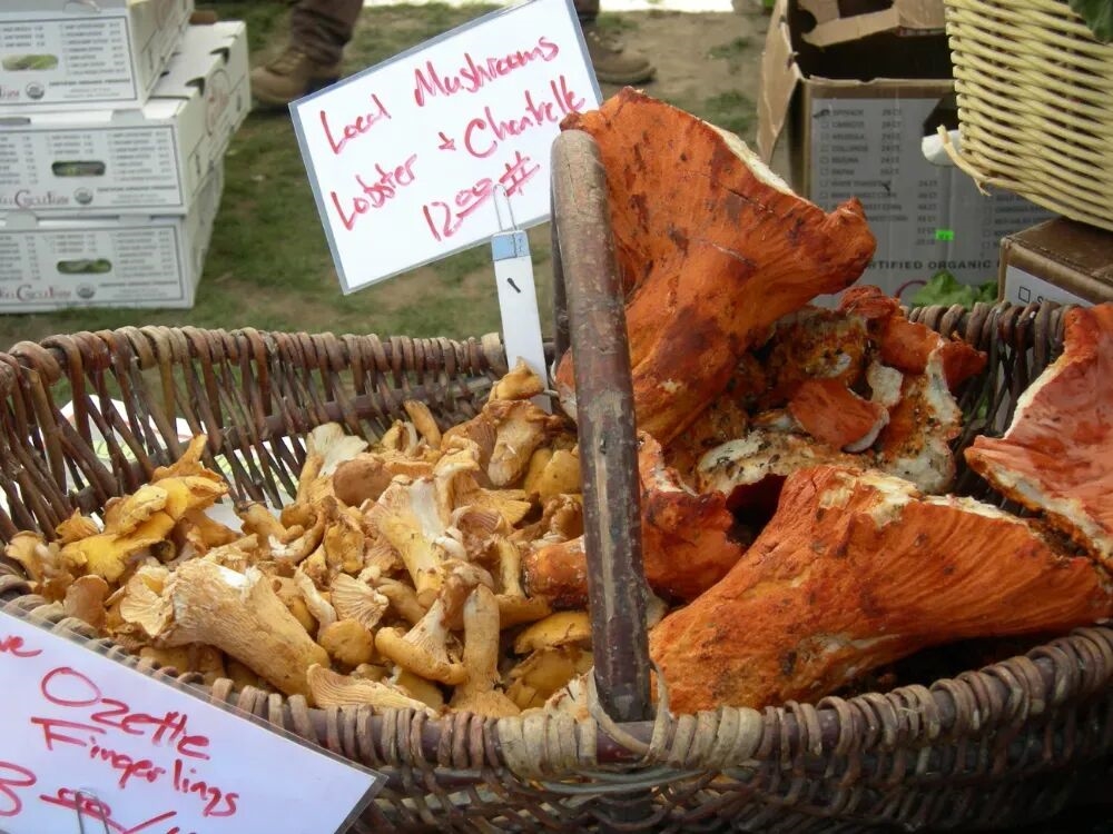 北美市场上售卖的蘑菇,左边是鸡油菌,右边是龙虾菇,图片来源:参考文献[7]
