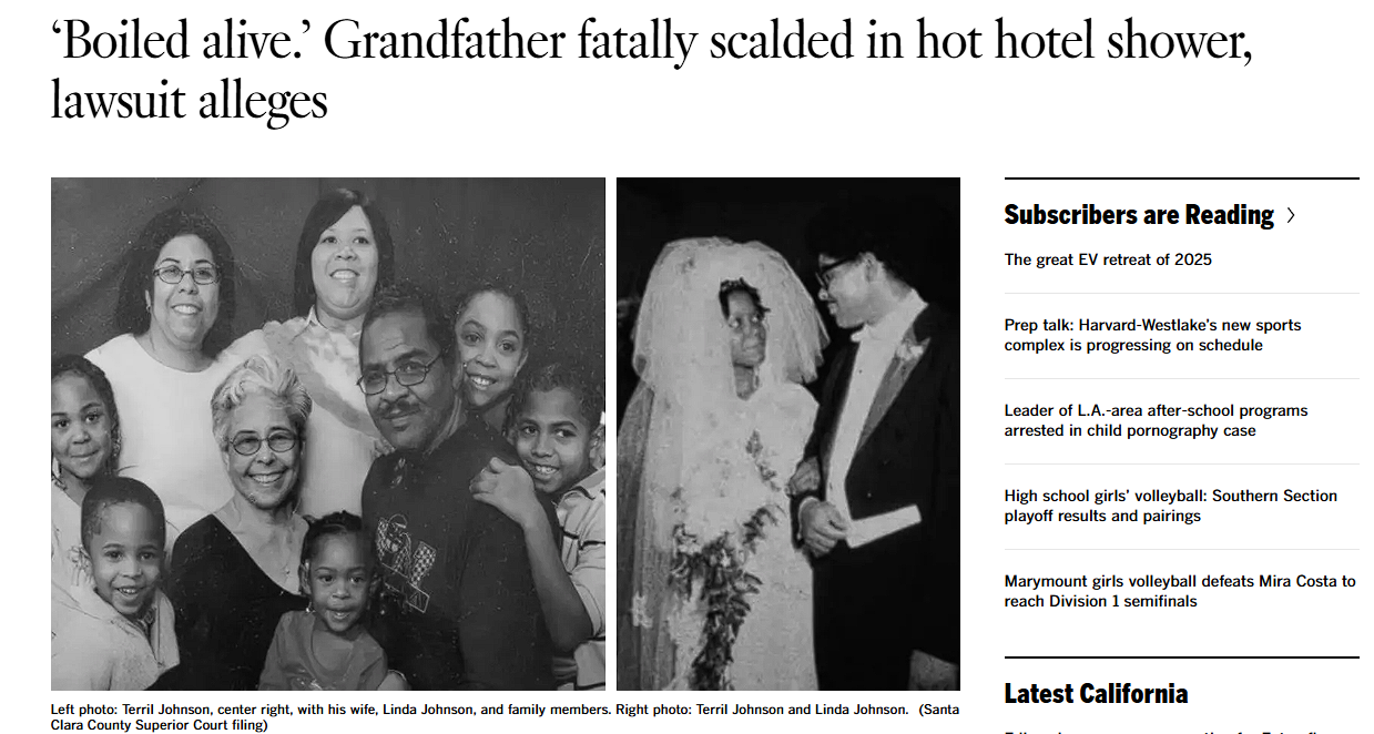 今年5月22日,美国加州一名72岁的退伍军人特里尔・约翰逊在圣何塞机场万豪费尔菲尔德套房酒店淋浴时,因热水温度过高导致全身33%严重烫伤,最终不幸离世。据悉,约翰逊当天与家人驱车6小时从洛杉矶抵达圣何塞,准备参加孙女的大学毕业典礼。